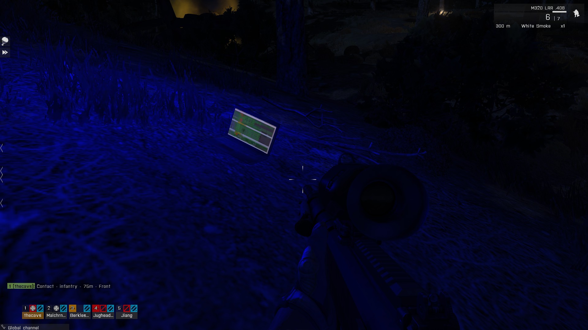 Once I had a sniper rifle with a nightstalker scope in my hands, I figured it was time to see what had happened to our pilots. The enemy helo had left, so we crept across the valley and into the forest. Our chopper had settled into a gulley, a few flames still flickering amid the wreckage. My scope showed the heat signatures of two OPFOR soldiers alongside it.