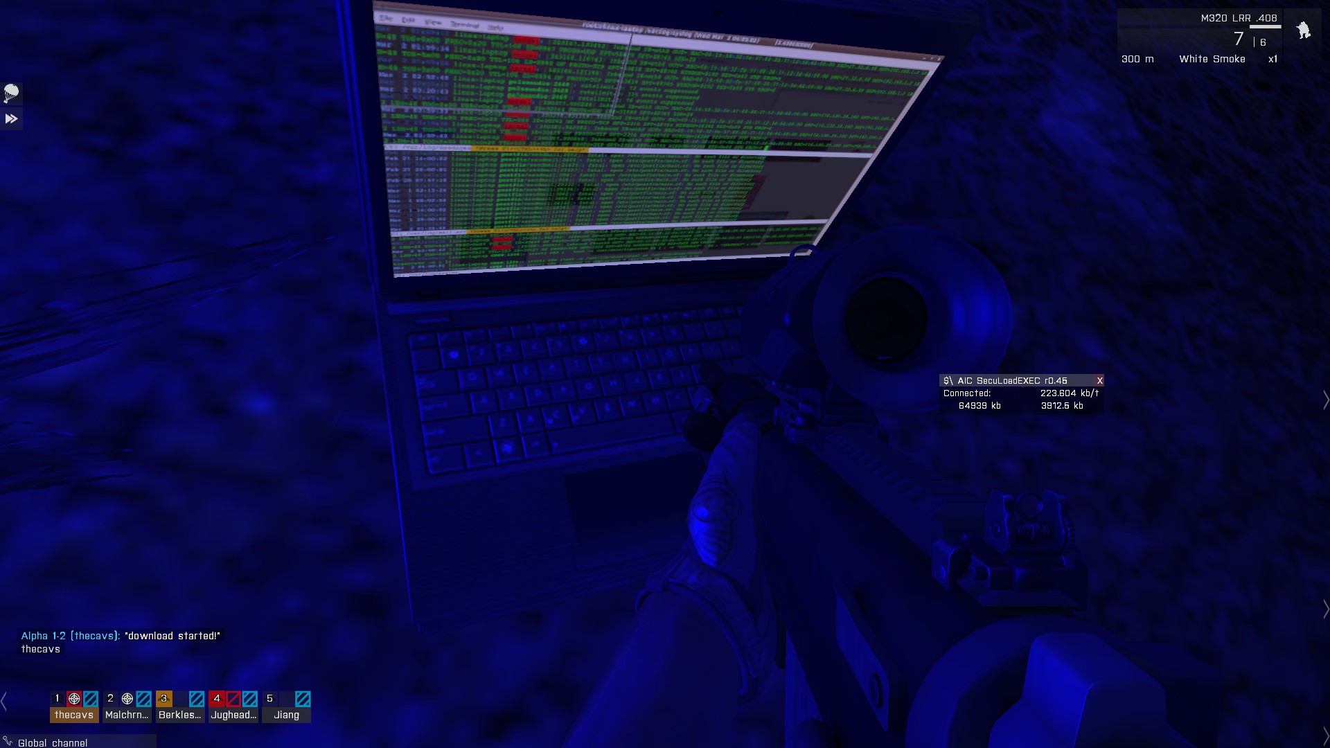Suddenly shots rang out- it was a trap! I fell next to the laptop as tracers criscrossed through the trees. We eliminated the enemy force, I was patched up, and I could get a look at our prize. Some quick hacking and their recent files started to download.