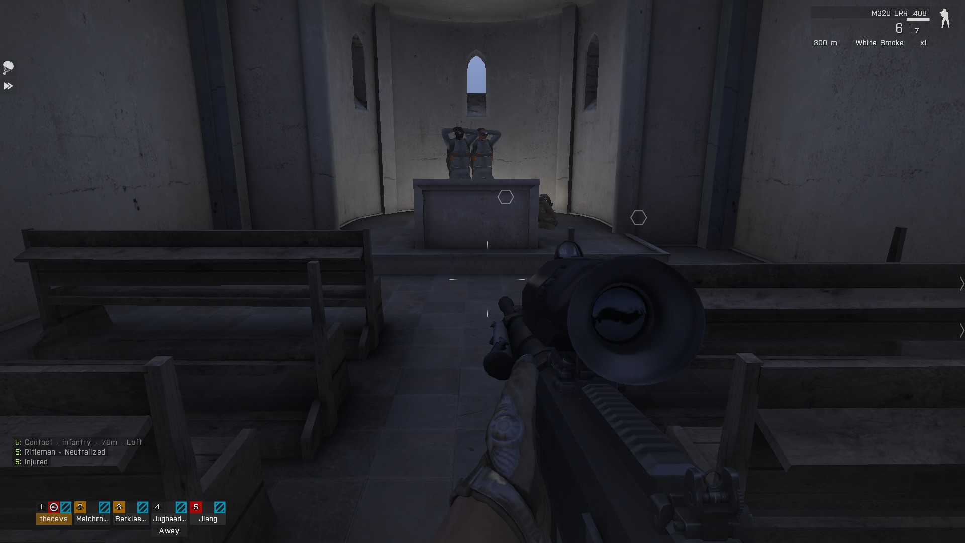 Once I was revived we pressed the attack house to house. I shot two guards at the chapel, burst inside and found our missing men!